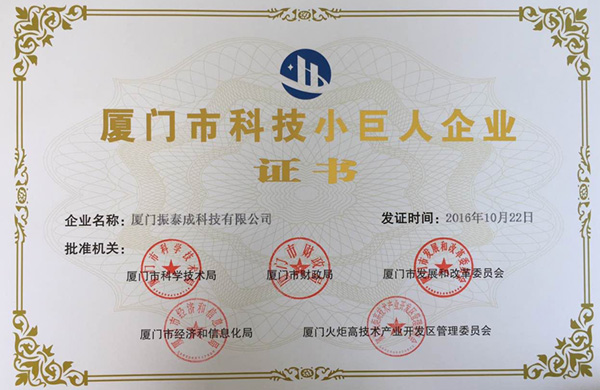 熱烈祝賀我公司廈門振泰成科技有限公司于2016年10月獲得獲得“廈門市科技小巨人”的榮譽證書,謝謝廈門市科學(xué)技術(shù)局、廈門市財政局、廈門市經(jīng)濟和信息化局、廈門火炬高新技術(shù)產(chǎn)業(yè)開發(fā)區(qū)管理委員會和廈門市發(fā)展和改革委員會對我司的高度肯定!